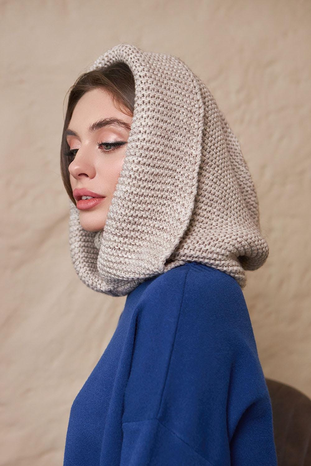 The multifunctional winter accessory is made of semi-woolen yarn.