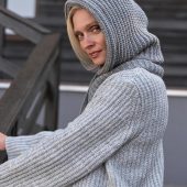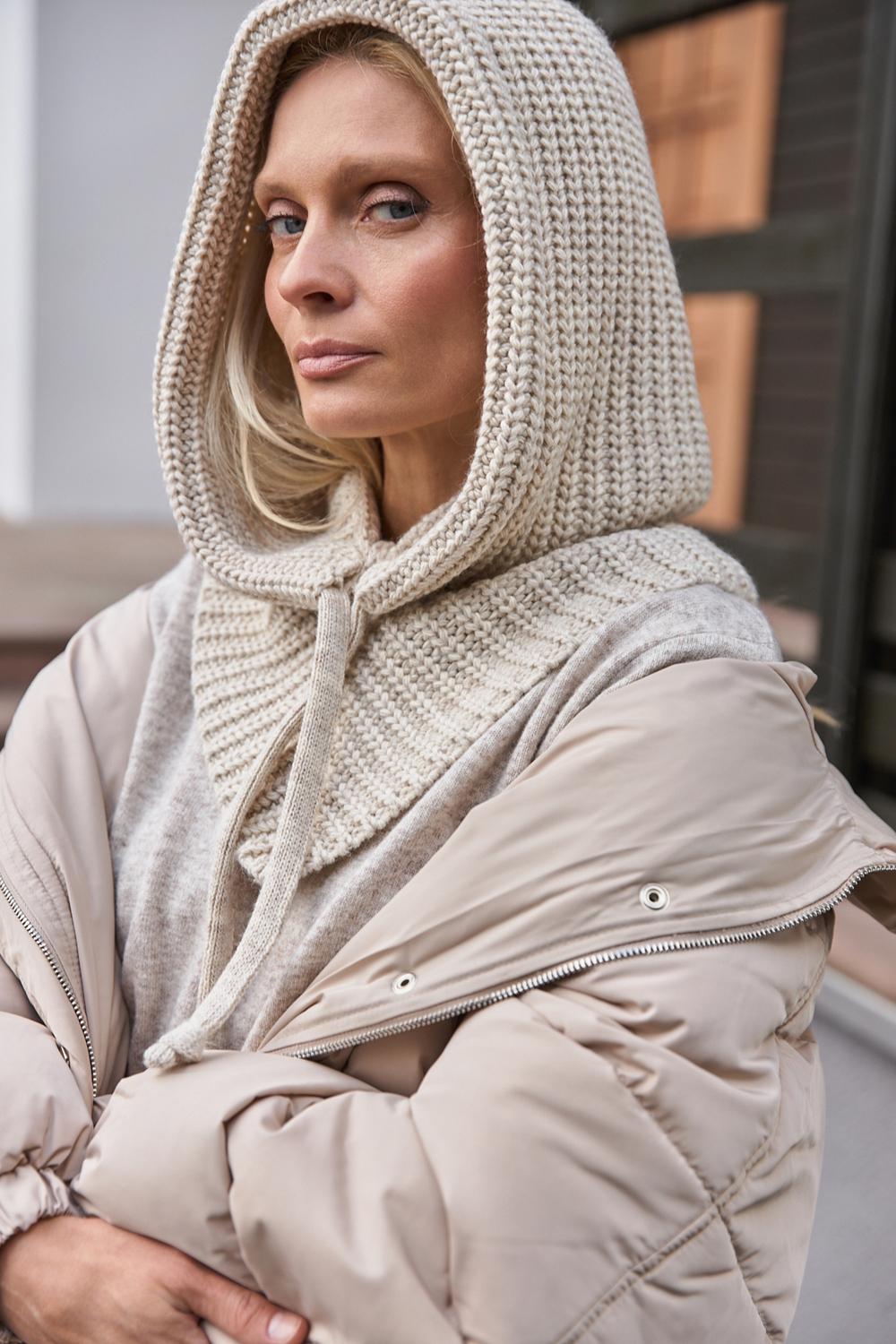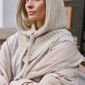 The model consists of an elastic collar that covers the neck well and a spacious hood in a textured weave.