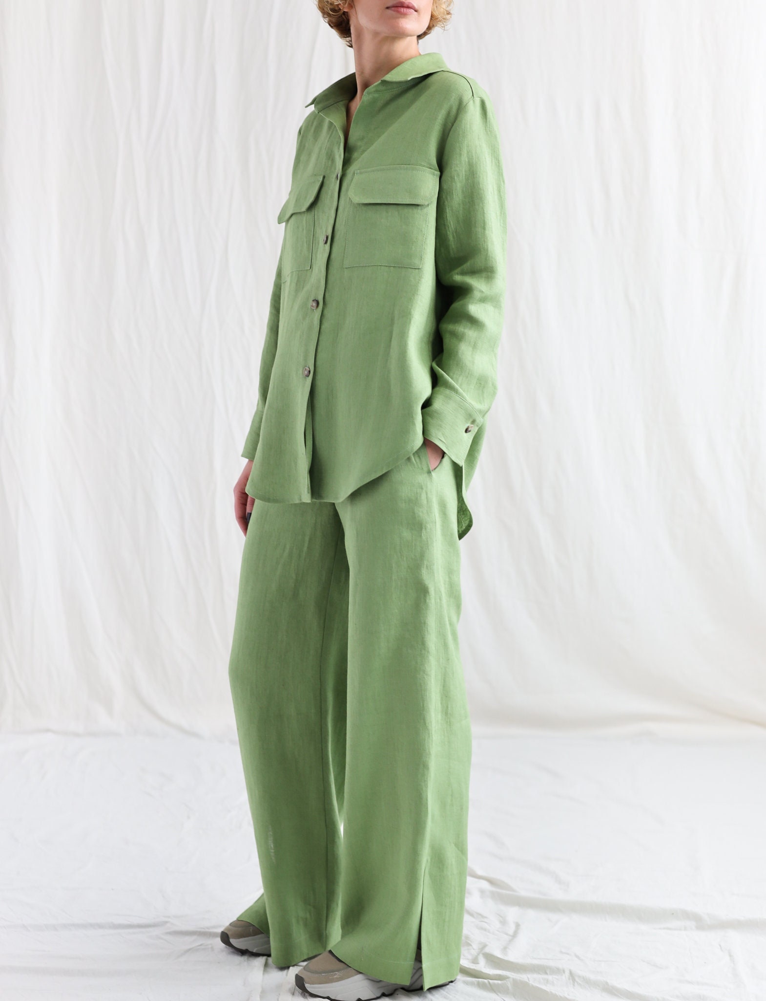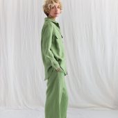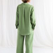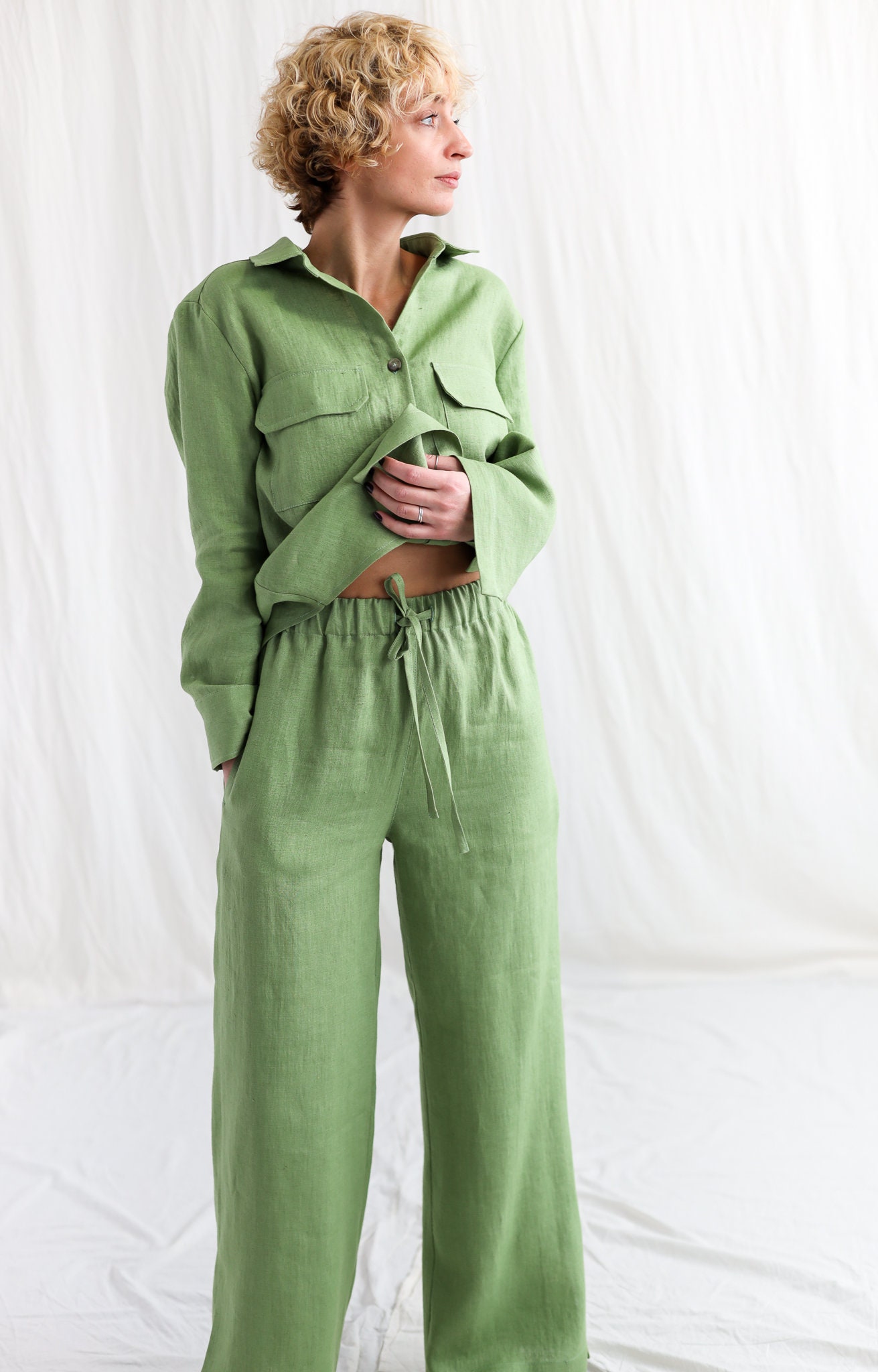 Simona is wearing “Foliage” color linen shirt and trousers in size S and is 172 cm/5’8″ tall.