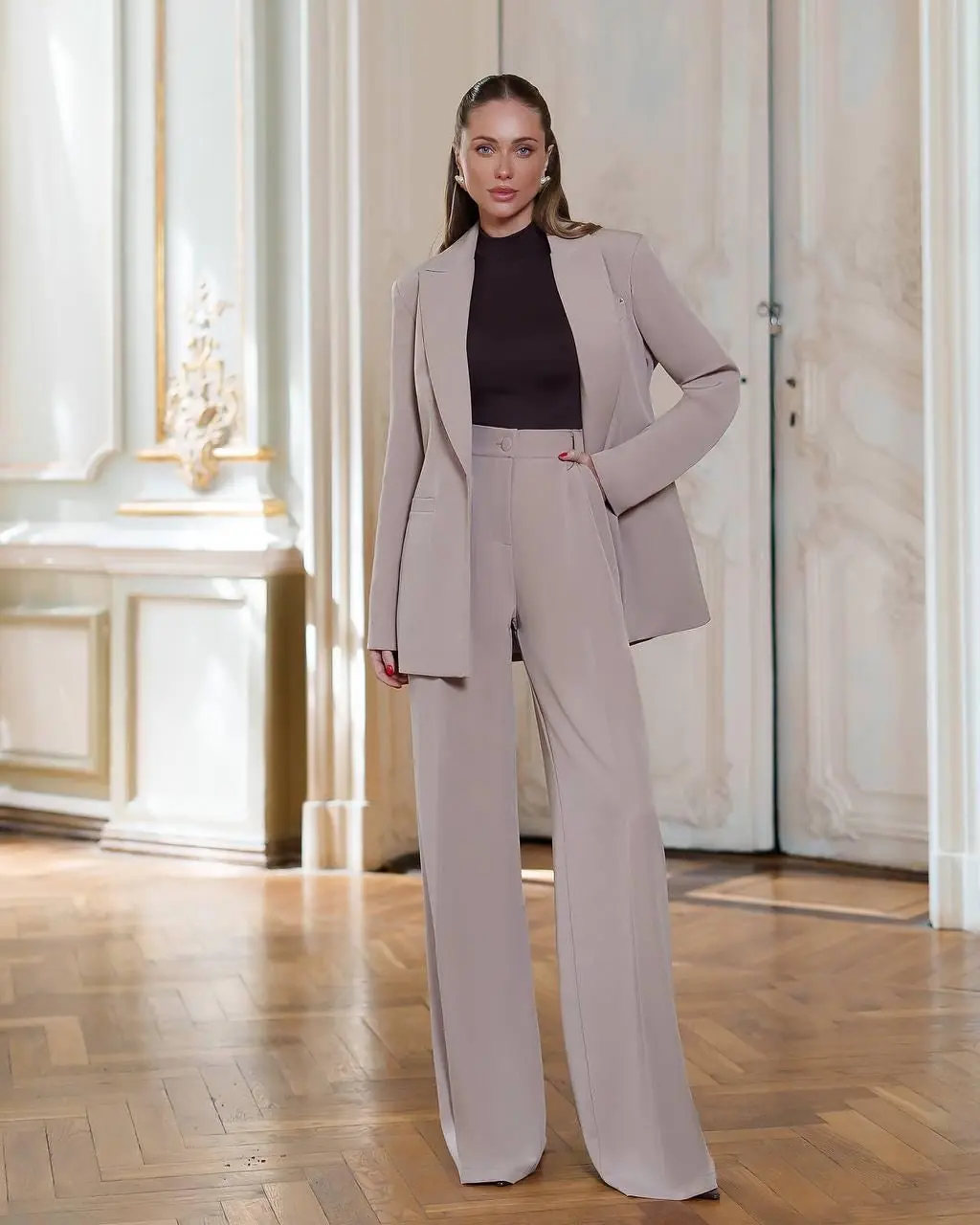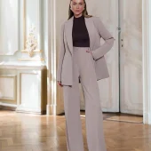 Elevate your style with this elegant women’s suit set made from premium diagonal suiting crepe. The set includes a tailored blazer and wide-leg trousers with a flattering high waist. Perfect for business. formal events. or a polished everyday look.